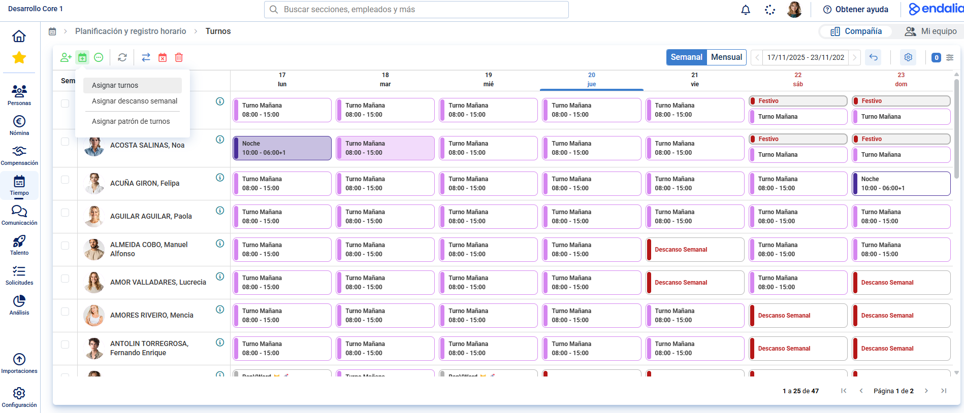 1. Lo primera será acceder al apartado de Gestión del tiempo -> Planificación -> Turnos, en el apartado de asignación aparecerán las opciones de Asignar turnos y Asignar descaso semanal: