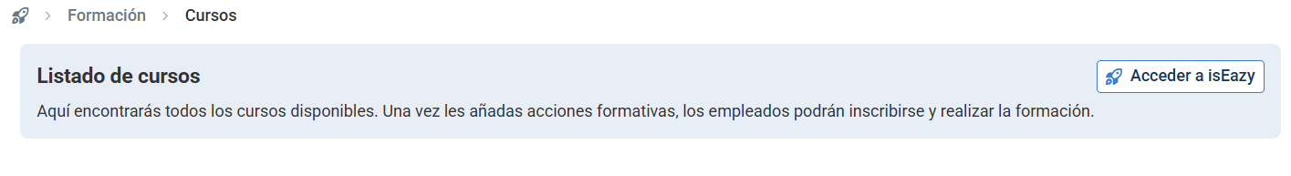 - Navega a Formación de empleados > Cursos. Si tiene el permiso activado, en la esquina superior derecha aparecerá el botón "Acceder a isEazy"