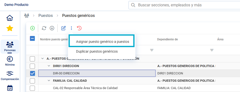 Dentro del hub Personas y puestos, dirígete a Puestos > Puestos genéricos.
