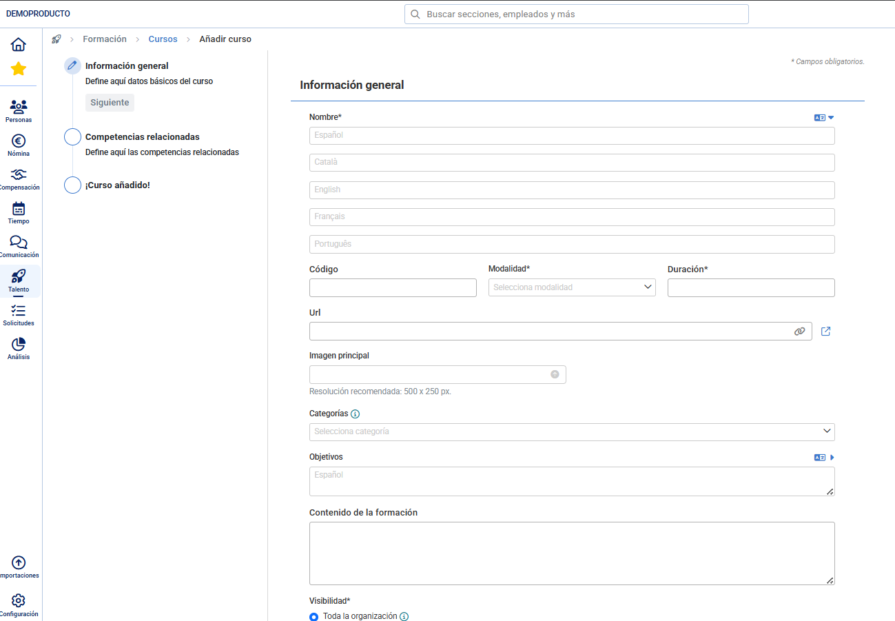- Aunque "Objetivos" y "Contenido" son opcionales, es muy recomendable completarlos. Ayudan a colaboradores a entender si la formación es relevante para ellos.