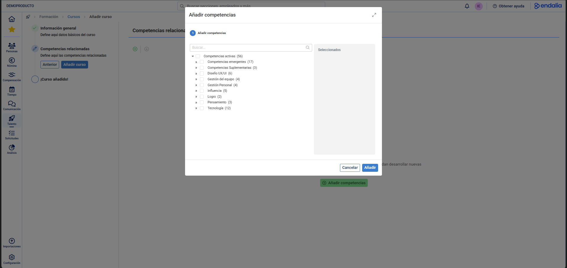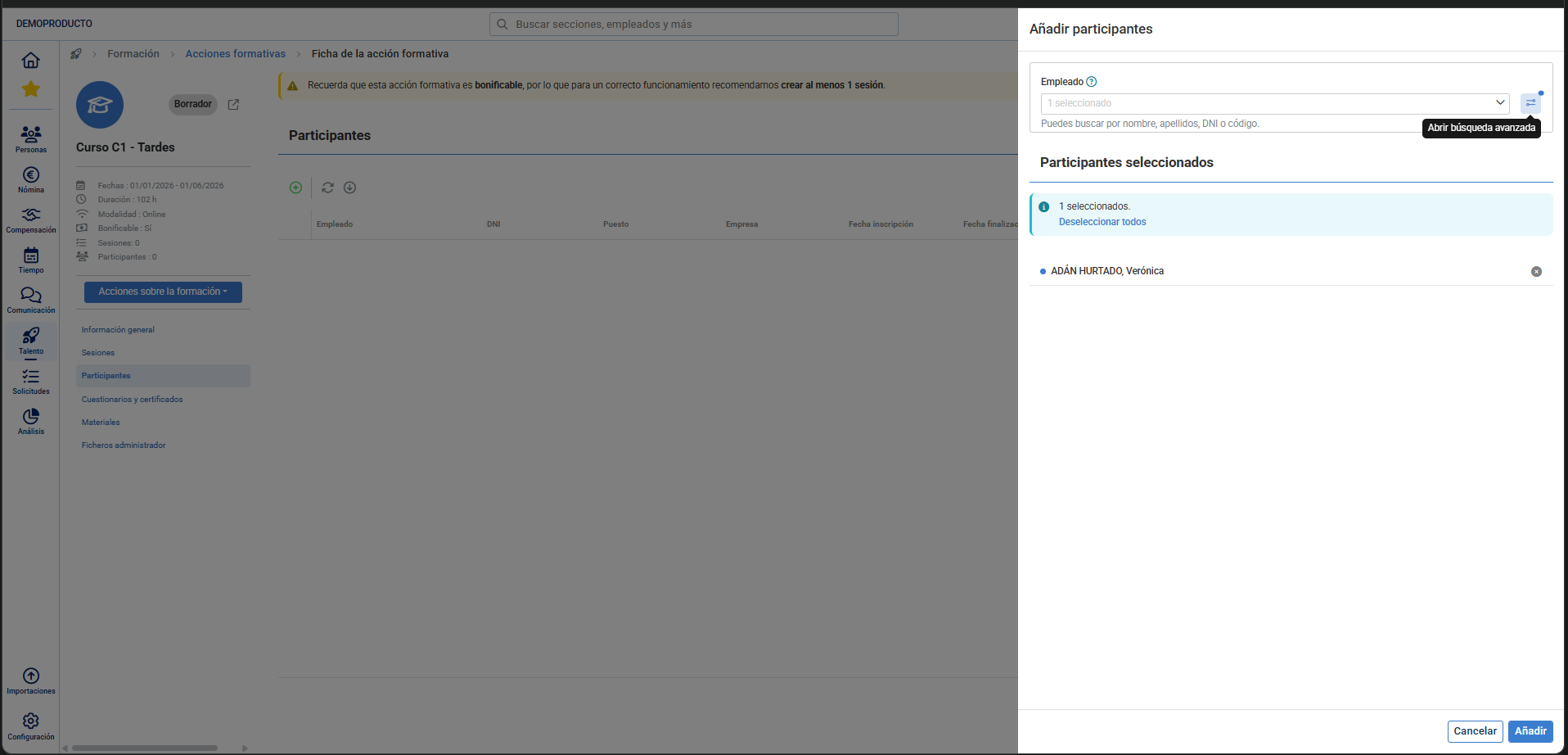 - Añadir participantes: Añade colaboradores como participantes de la acción formativa. Puedes añadir participantes después de crear la acción formativa desde su ficha.