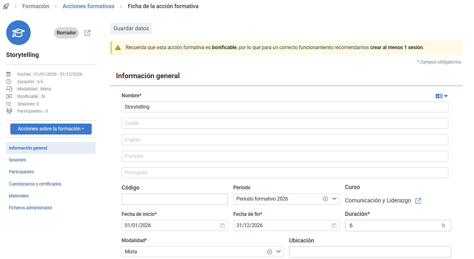 Paso 1: Completa los datos básicos de la acción formativa. La acción formativa se creará en estado "Borrador"