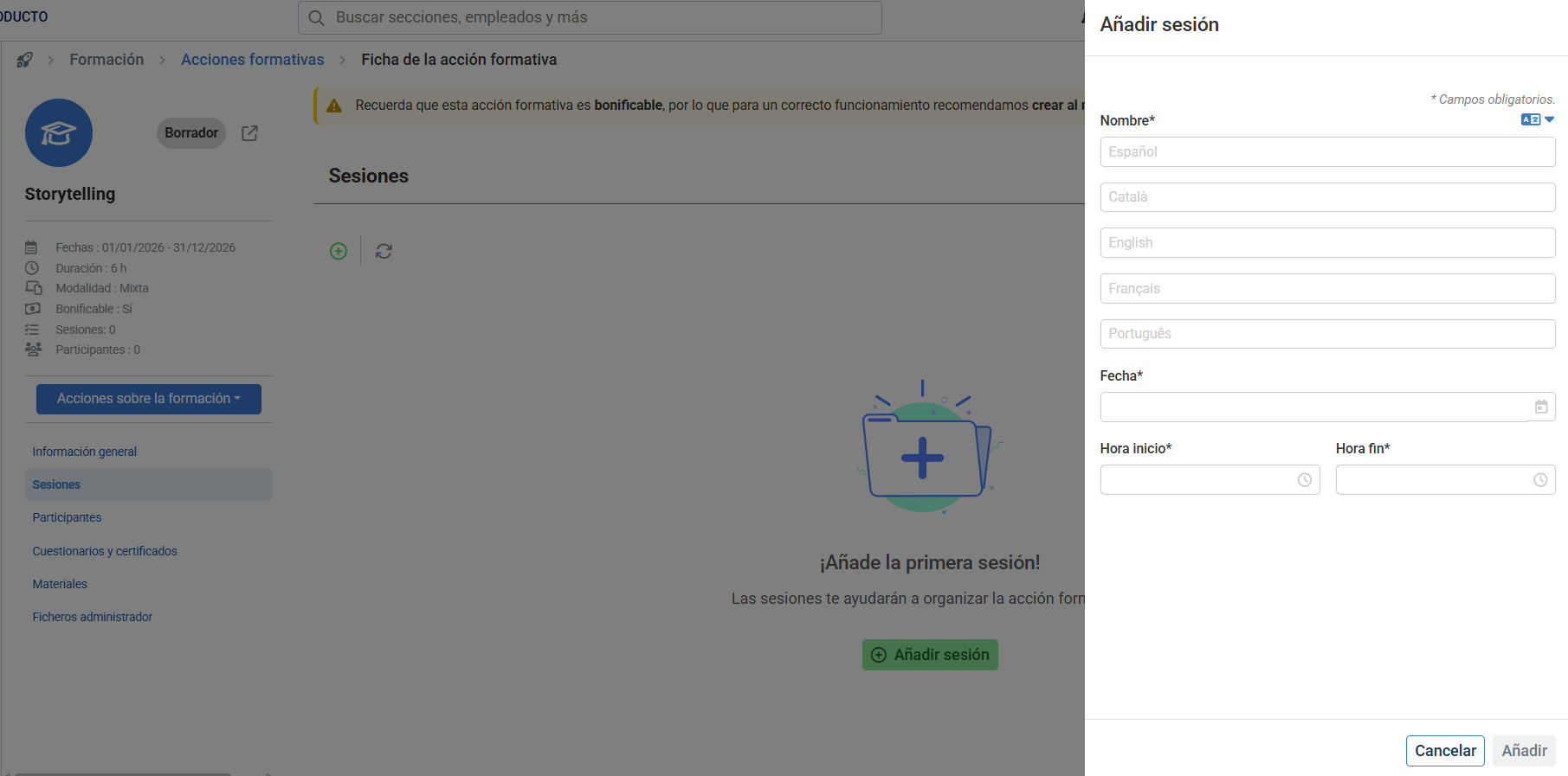 - Añadir sesiones: Las sesiones son los tramos (fecha y hora) en los que se organiza la acción formativa.