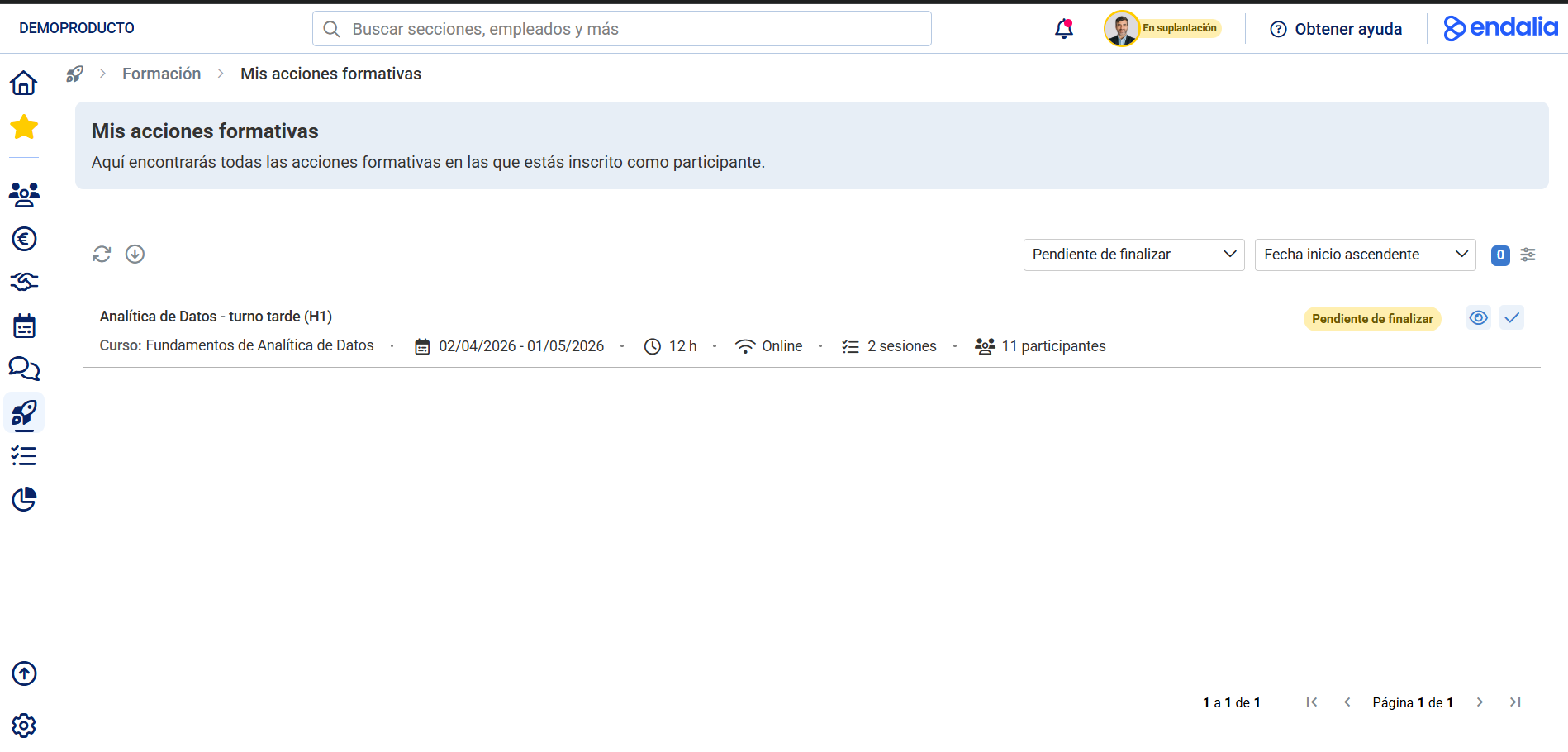 Dentro del hub Talento, dirígete al módulo Formación > Mi formación > Mis acciones formativas. Localiza las acciones formativas que estén en estado Pendiente de finalizar.