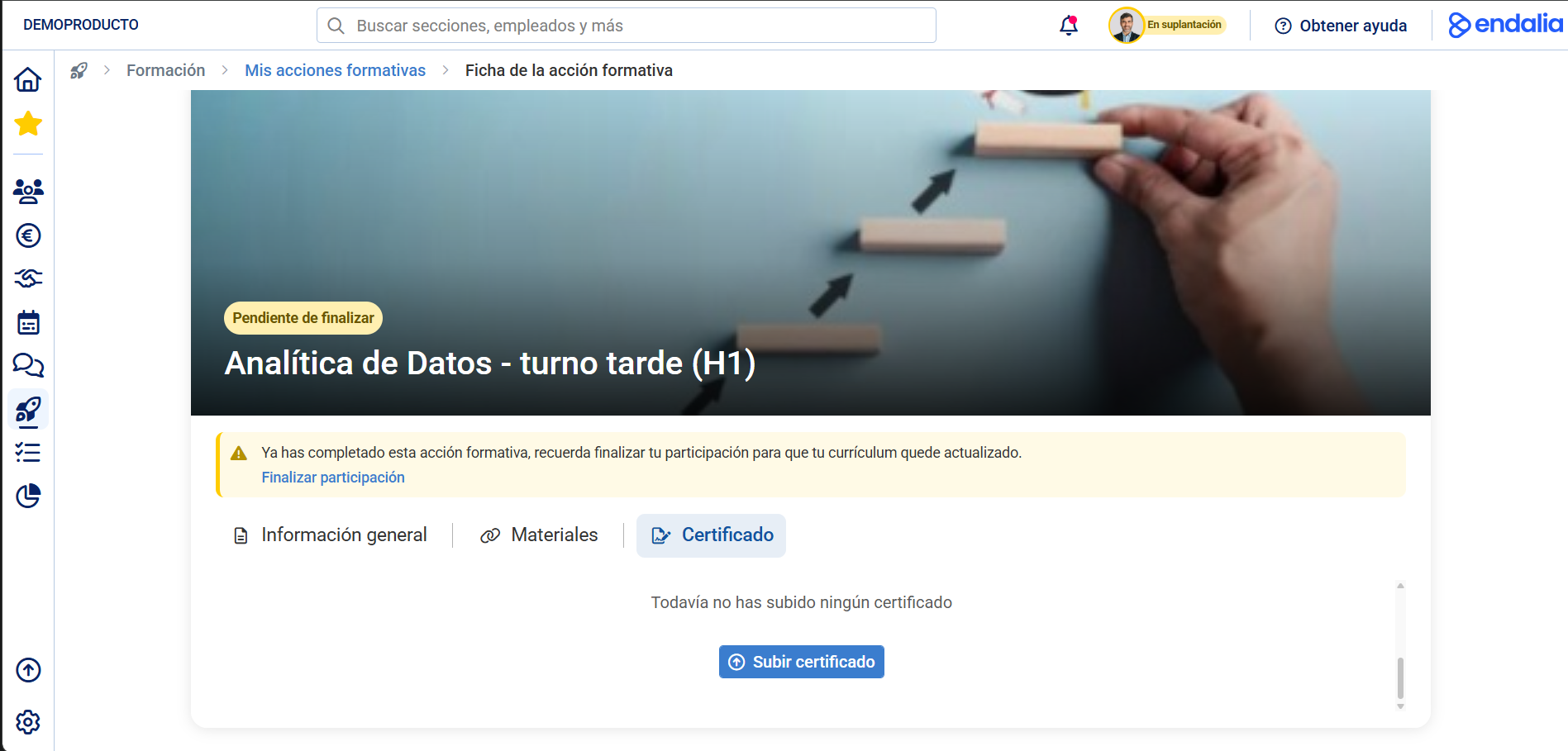 - El administrador debe haber configurado la acción formativa para permitir que los participantes suban sus certificados