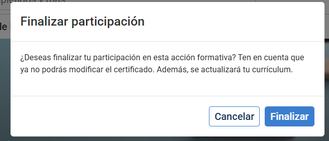 Al hacer clic en el botón del tick (✓), se abrirá una ventana modal de confirmación. Pulsa en Finalizar para confirmar