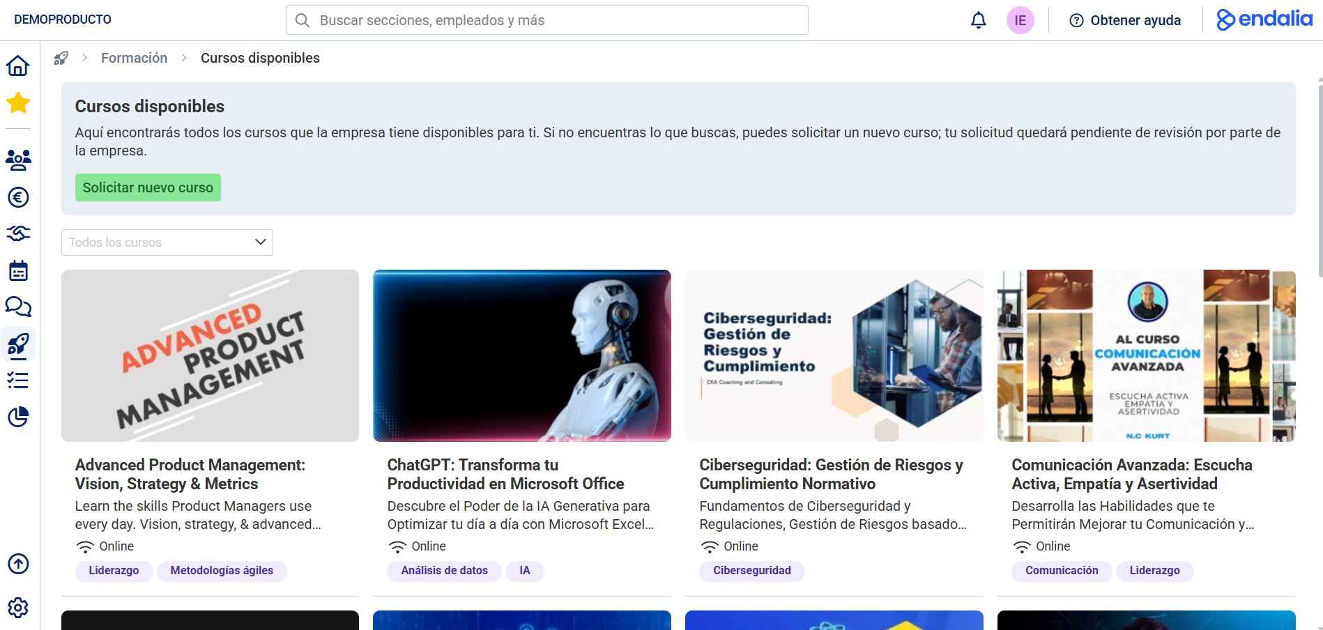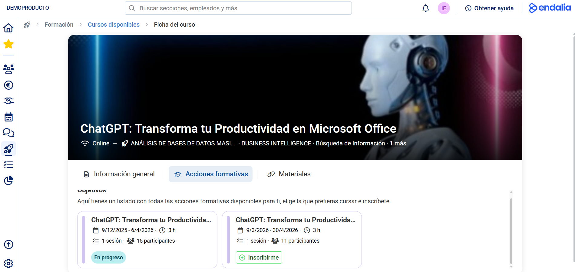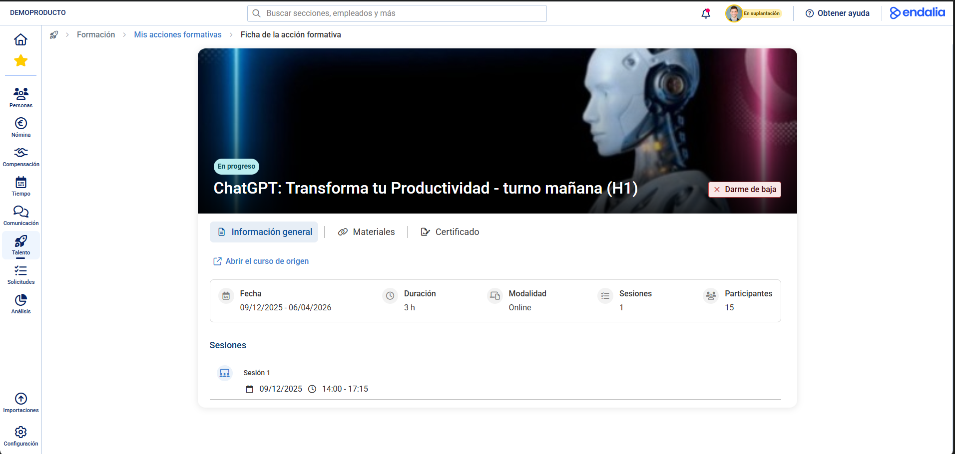 Dentro del hub Talento, dirígete al módulo Formación > Mi formación > Cursos disponibles. Explora el catálogo de cursos, filtra por categoría si lo necesitas, y haz clic en la ficha del curso que te interesa.