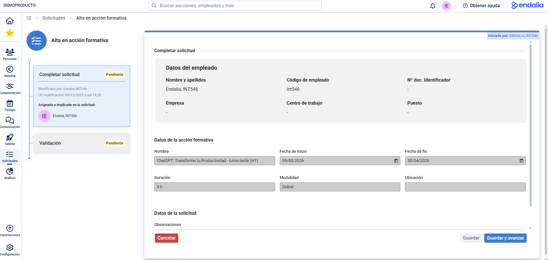 Ahora, la solicitud de alta pasará a las siguientes fases para ser gestionada por el Responsable (opcional) y por RR.HH.