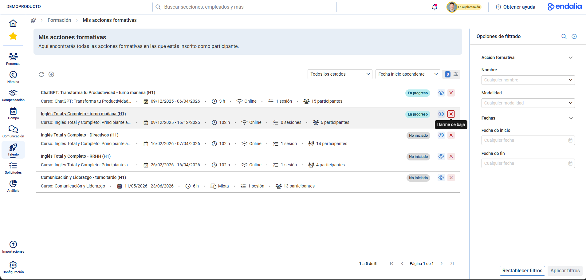 Como colaborador, puedes solicitar inscribirte en las acciones formativas que te interesan o darte de baja de aquellas en las que ya no puedes o no deseas participar.