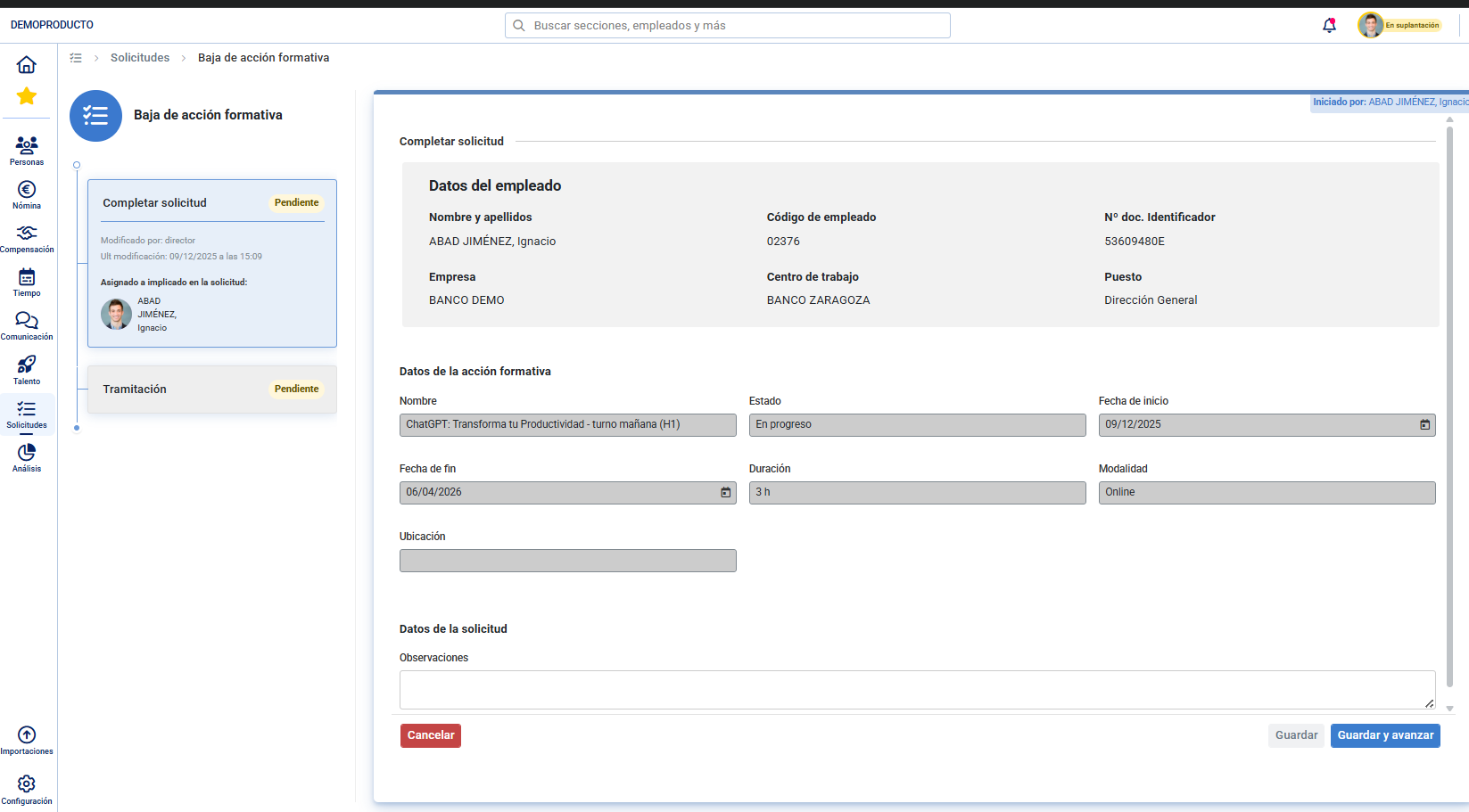 - Requiere aprobación: Tu solicitud pasa por fases configurables de validación (responsable, opcional) y tramitación (RRHH).