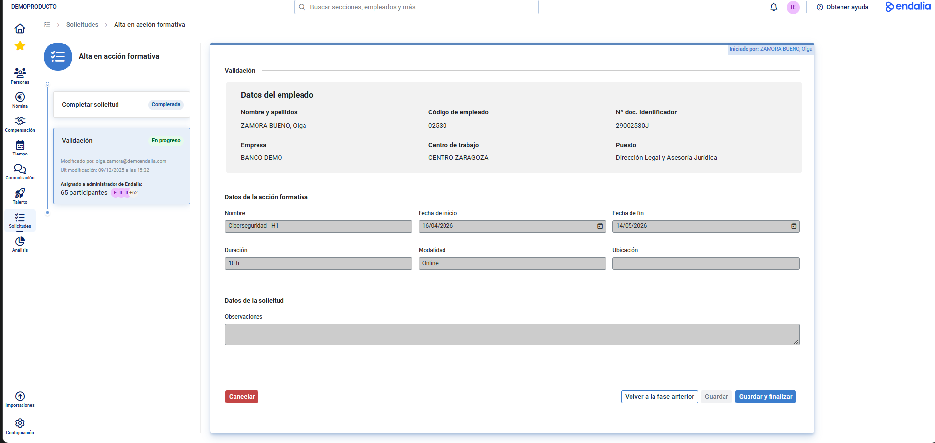 Entra en la solicitud para validar (Botón de "guardar y finalizar") o rechazar (botón de "Cancelar") la solicitud.