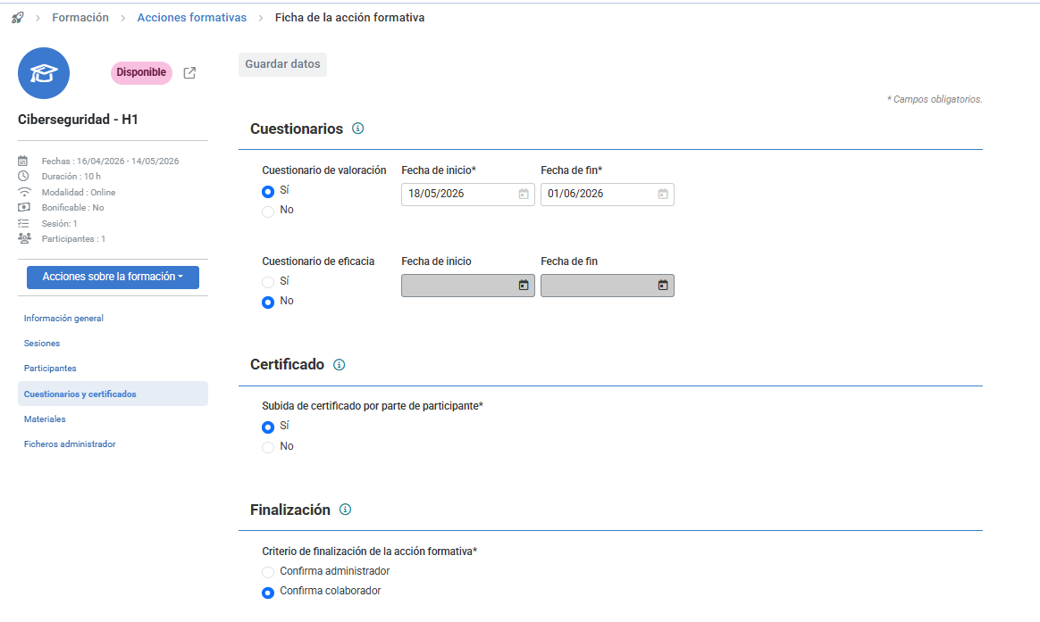 Desde la pestaña "Cuestionarios y certificados" de la ficha de la acción formativa, puedes configurar: