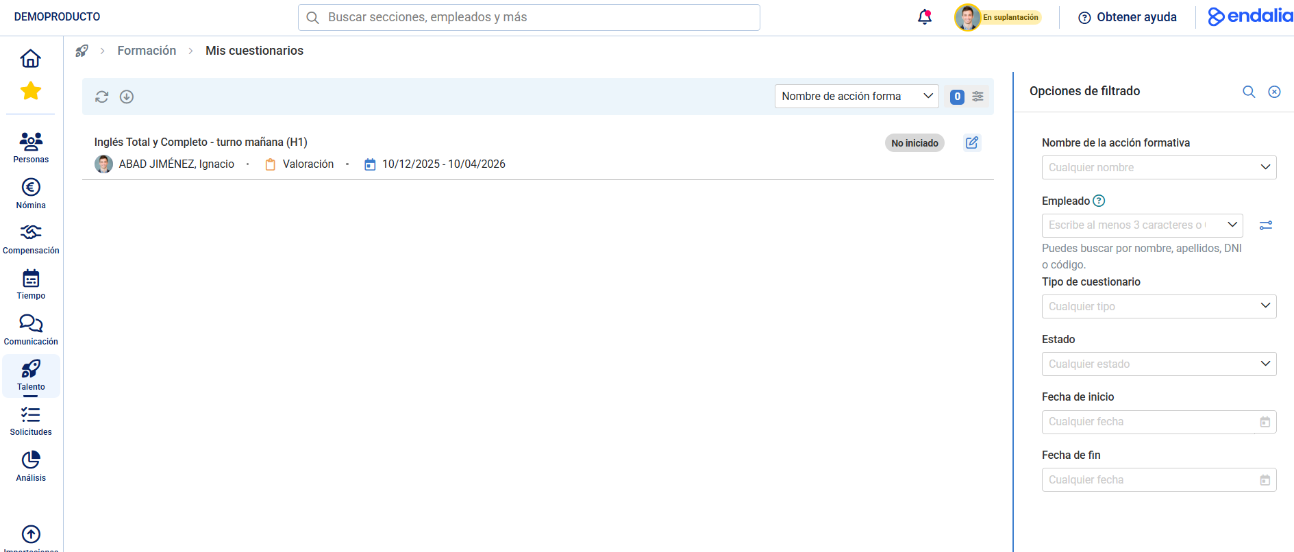En el hub Talento, dirígete al módulo Formación > Mi formación > Mis cuestionarios.