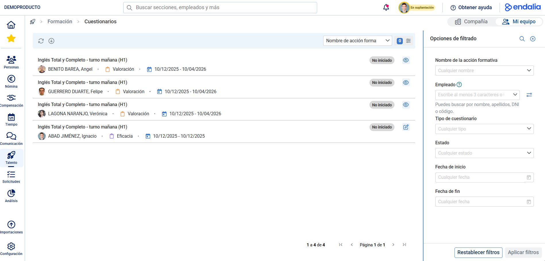Nota: Puedes acceder a los cuestionarios de eficacia por distintas vías: - Con la ruta Desempeño y talento > Formación > Mi equipo > Cuestionarios: