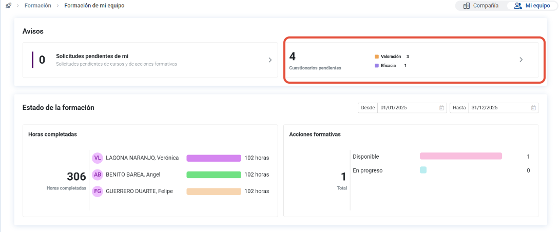 El objetivo de esta funcionalidad es que, como responsable de equipo, puedas valorar la eficacia de la acción formativa en el día a día, o del desempeño de tu equipo.