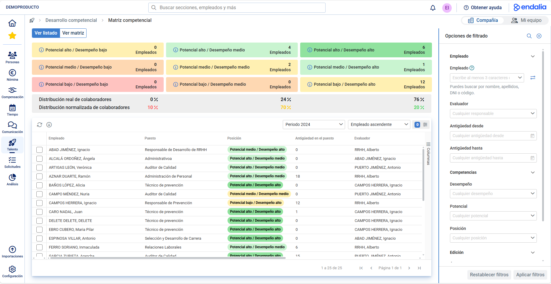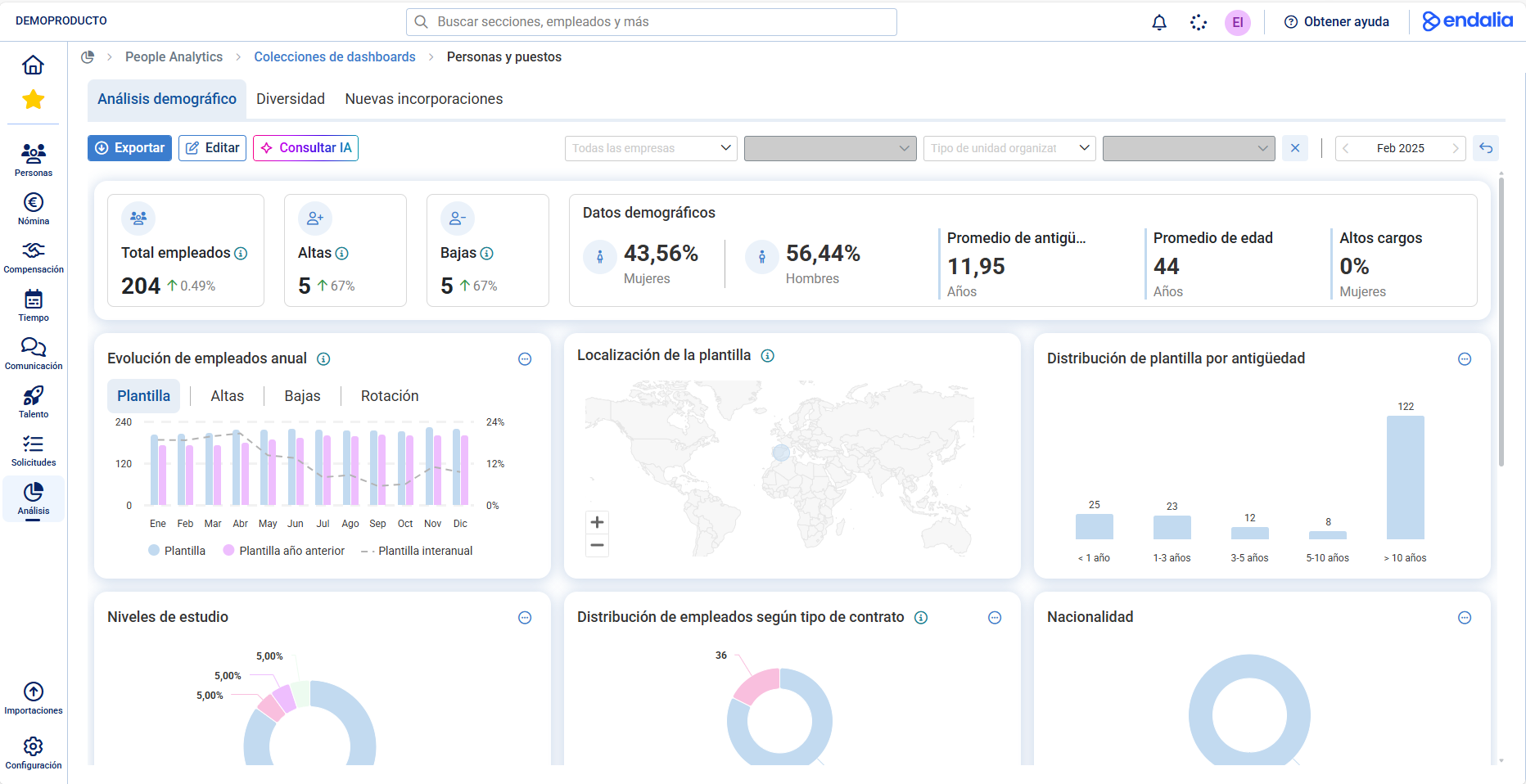 Descubre People Analytics, el nuevo módulo impulsado por IA. De datos a mejores decisiones en segundos. Nuestra solución de análisis de datos de RRHH transforma la información de tu organización en decisiones estratégicas. Incorporamos dashboards interactivos con métricas clave de plantilla, rotación, absentismo y compensación, junto con herramientas de segmentación para analizar tus datos por departamento, ubicación o cualquier criterio relevante. Incluimos también un chat de IA que te ayudará a descubrir tendencias de tu organización y actuar de forma proactiva. Todo integrado con el resto de módulos de Endalia para una visión completa de tu capital humano.