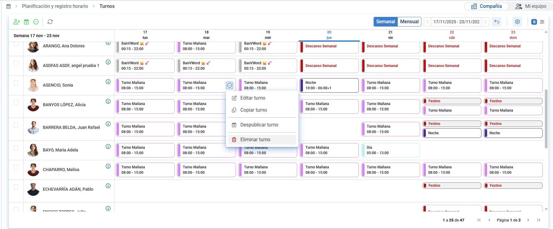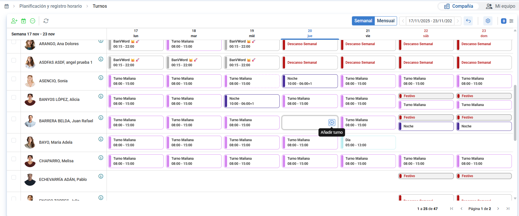 - Les cellules où une personne ne peut pas être gérée par équipe (qui n'était pas encore incluse à l'écran, n'a pas de contrat en vigueur ou les journées sont closes) apparaîtront ombrées en gris et aucune action décrite précédemment ne pourra être exécutée.