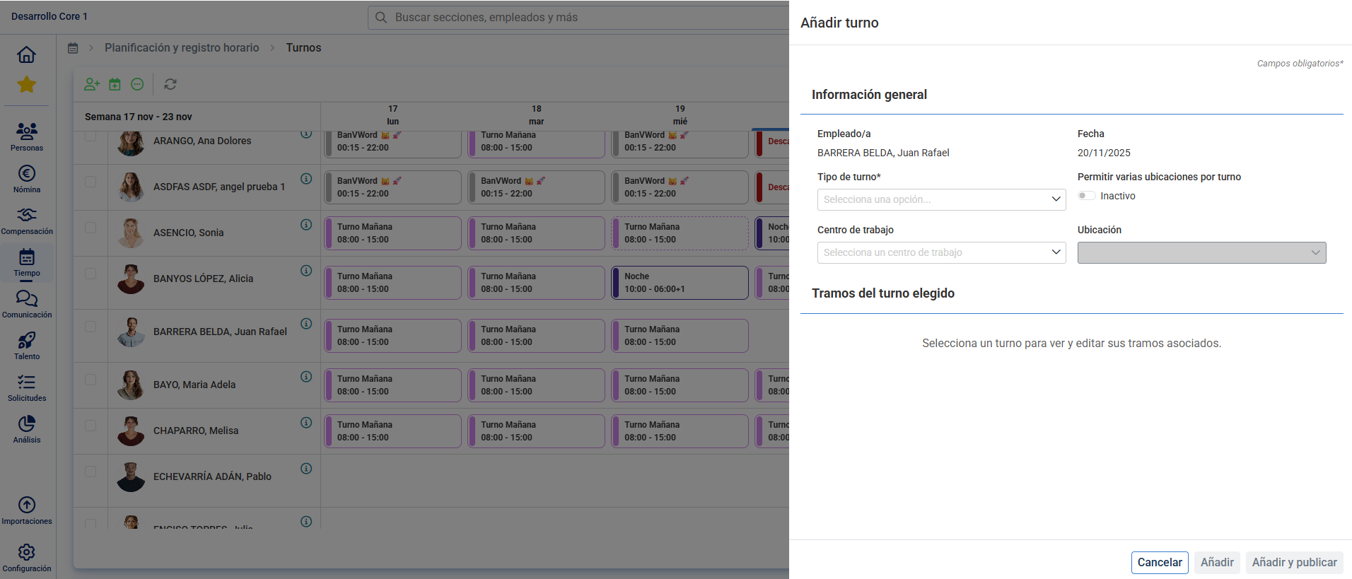 - Sélectionnez le type d'équipe et sa durée. Ensuite, appuyez sur Ajouter ou Ajouter et publier. De retour à l'écran principal, la nouvelle équipe est visible en surbrillance à côté de l'employé. Double-cliquez dessus pour le modifier ou le supprimer, selon vos préférences, avec les boutons habilités à cet effet situés dans la fenêtre modale émergente :