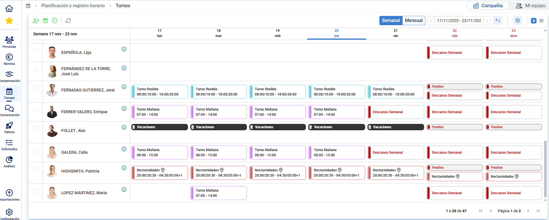 - Des filtres par nom d'équipe et statut sont incorporés à droite de l'écran pour consulter rapidement quels employés sont assignés à une équipe spécifique, en plus de la consultation des totaux d'employés et d'heures planifiées dans la partie supérieure.