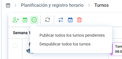 Il existe une option de publication/dépublication par sélection d'employés, où en fonction des employés sélectionnés et des équipes incorporées, les actions pour publier ou dépublier la semaine ou le mois seront affichées :